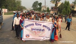 १५ जेठ, वीरगञ्ज । गणतन्त्र दिवस, वीरगञ्जमा पनि विभिन्न कार्यक्रम गरी मनाइएको छ । गणतन्त्र दिवस ०७६ जिल्ला समारोह समिति पर्साको आव्हानमा बिहान वीरगञ्जमा प्रभातफेरिको आयोजना गरिएको हो । गणतन्त्रको संस्थागत विकास गरौं, गणतन्त्रलाई समृद्धिको आधारको रुपमा उपयोग गरौं भन्ने नाराका साथ गणतन्त्र दिवस मनाइएको हो । विभिन्न राजनीतिक दलका नेता, कार्यकर्ता, वुद्धिजीवि, उद्योगी, व्यापारी […]