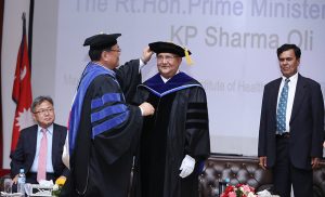 १५ जेठ, काठमाडौं । प्रधानमन्त्री केपी शर्मा ओलीलाई कोरियाको काङनाम विश्वविद्यालयले मानार्थ विद्यावारिधि (डाक्टर) को उपाधि प्रदान गरेको छ । बुधबार काठकाडौंमा एक कार्यक्रमको आयोजना गरेर विश्विद्यालयलका प्रेसिडेन्ट डा.शिनिल युनले प्रधानमन्त्री ओलीलाई उपाधि प्रदान गरेका हुन् । प्रधानमन्त्री ओलीले नेपालमा लोकतन्त्रका लागि उच्च योगदान गरेको भन्दै उक्त विश्वविद्यालयले सो उपाधि प्रदान गरेको प्रधानमन्त्रीको सचिवालयद्वारा प्रेसित […]