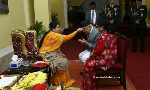 २१ असोज, काठमाडौं । राष्ट्रपति विद्यादेवी भण्डारीले प्रधानमन्त्री केपी शर्मा ओलीलाई दसैंको टीका लगाइदिएकी छन् । राष्ट्रपति भण्डारीले मंगलबार अपरान्ह १ बजेर ३५ मिनेटमा राष्ट्रपति भवन शितलनिवास पुगेका ओलीलाई दशैंको टीका, जमरा र माला लगाइदिएका हुन् । भण्डारीले ओली पत्नी राधिका शाक्यलाई पनि टीका दिएकी छन् । उनले प्रधानन्यायाधीश चोलेन्द्रशमशेर जबरा, राष्ट्रिय सभाका अध्यक्ष गणेशप्रसाद […]