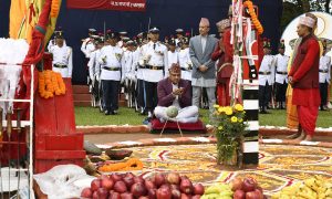 २० असोज, काठमाडौं । प्रहरी महानिरीक्षक सर्वेन्द्र खनालले नेपाल प्रहरीले परम्परागत रुपमा मनाउँदै आएको बडा दसैंका अवसरमा सोमबार प्रहरी प्रधान कार्यालय सशस्त्र प्रहरी गण नम्बर १ नक्सालस्थित मौलोमा पूजाअर्चना तथा सङ्कल्प पूजा गरे । पूजाअर्चनाको क्रममा खनालले बली पूजा गर्नुको साथै निसानमा पञ्जा छाप समेत लगाए । साथै मौलोपूजाका अवसरमा विशेष कार्य गर्ने प्रहरी सहायक निरीक्षक […]