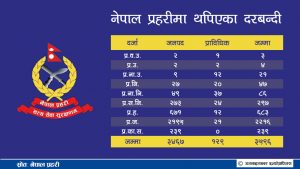 २८ असोज, काठमाडौं । नेपाल प्रहरीमा ३ हजार ५ सय ९६ दरबन्दी थप भएको छ । मन्त्रिपरिषद बैठकले गृह मन्त्रालयको प्रस्ताव स्वीकृत गरेसँगै प्रहरीमा दरबन्दी थपिएको हो । मन्त्रालयका एक अधिकारीका अनुसार दरबन्दी स्वीकृतिसँगै कार्यान्वयनका लागि प्रहरी प्रधान कार्यालयलाई पत्राचार गरिसकिएको छ । थपिएका दरबन्दीमा ३ प्रहरी वरिष्ठ उपरीक्षक (एसएसपी), चार जना प्रहरी उपरीक्षक (एसपी), […]