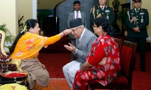 २१ असोज, काठमाडौं । राष्ट्रपति विद्यादेवी भण्डारीले प्रधानमन्त्री केपी शर्मा ओलीलाई दसैंको टीका लगाइदिएकी छन् । राष्ट्रपति भण्डारीले मंगलबार अपरान्ह १ बजेर ३५ मिनेटमा राष्ट्रपति भवन शितलनिवास पुगेका ओलीलाई दशैंको टीका, जमरा र माला लगाइदिएका हुन् । भण्डारीले ओली पत्नी राधिका शाक्यलाई पनि टीका दिएकी छन् । उनले प्रधानन्यायाधीश चोलेन्द्रशमशेर जबरा, राष्ट्रिय सभाका अध्यक्ष गणेशप्रसाद […]