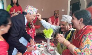 २१ असोज, काठमाडौं । राष्ट्रिय प्रजातन्त्र पार्टीका अध्यक्ष कमल थापाले दाजु तथा भाउजुको हातबाट दशैंको टीका लगाएका छन् । थापाले दाजु अवकास प्राप्त रथी नेत्रबहादुर थापा र भाउजु अमिताको हातको टीका लगाएका हुन् । आफूले टीका ग्रहण गरे पश्चात उनले परिवारका अन्य सदस्यलाई टीका लगाइदिएका थिए ।