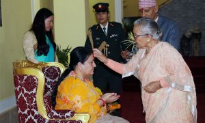 २१ असोज, काठमाडौं । राष्ट्रपति विद्यादेवी भण्डारीले विजयादशमीको टिका लगाएकी छन् । उनले मंगलबार दिउँसो आफन्त र पुजारीबाट दशैंको टिका लगाएकी हुन् । आफूले टिका लगाएपछि उनले पुजारी, आफन्त लगायतलाई टिका लगाइदिइरहेकी छन् । तस्वीरहरूः रत्न श्रेष्ठ/रासस