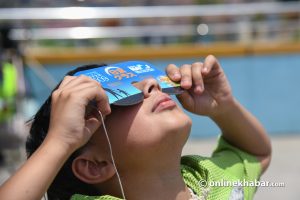 ७ असार, काठमाडौं । आसार कृष्ण औँसीका दिन आइतबार बिहान १० : ५५ बजेदेखि खण्डग्रास (आधा सूर्य ढाक्ने) सूर्यग्रहण लागिरहेको छ । बिहान १०: ५५ बजे स्पर्श भएको सूर्यग्रहण मध्याह्न १२ : ३८ बजे मध्य र अपराह्न २ : २३ बजे मोक्ष प्राप्त गर्ने नेपाल पञ्चाङ्ग निर्णायक समितिले बताएको छ । सूर्यग्रहण हेर्न चाहनेलाई तक्षशिला […]