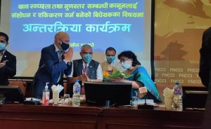 १३ असोज, काठमाडौं । राष्ट्रिय सभामा पेश भएको खाद्य स्वच्छता ऐनबारे छलफल गर्न उद्योग वाणिज्य महासंघ र खाद्य प्रविधि तथा गुण नियन्त्रण विभागले मंगलबार संयुक्त कार्यक्रम राखे । उद्योग वाणिज्य महासंघको हलमा दिउँसो साढे दुई बजेदेखि शुरु भएको कार्याक्रममा व्यवसायीहरु जम्मा भए । केही बेरमा विभागको तर्फबाट प्रतिनिधित्व गर्दै महानिर्देशक उपेन्द्र राय कार्यक्रम स्थल पुगे […]