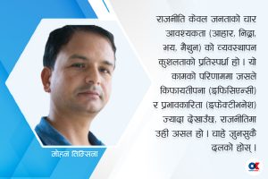 राजनीति यस्तो क्षेत्र हो, जहाँ ‘तीता’ र ‘मीठा’, दुवैखाले कुरा गर्नु जरूरी हुन्छ । तर राजनीतिकर्मीहरू प्रायः ‘मीठा’ कुरा मात्र गर्दछन् । अहंकार वा शक्तिको लालसाले ग्रस्त राजनीतिकर्मीका लागि यो ‘बाध्यता’ पनि हो । किनकि ‘तीता’ कुरा गर्दा लोकपि्रयता गुम्ने खतरा हुन्छ । ‘मीठा’ कुरा गर्दा जनताको सस्तो हाईहाई पाइन्छ । भोट जितिन्छ । राजनीतिक […]